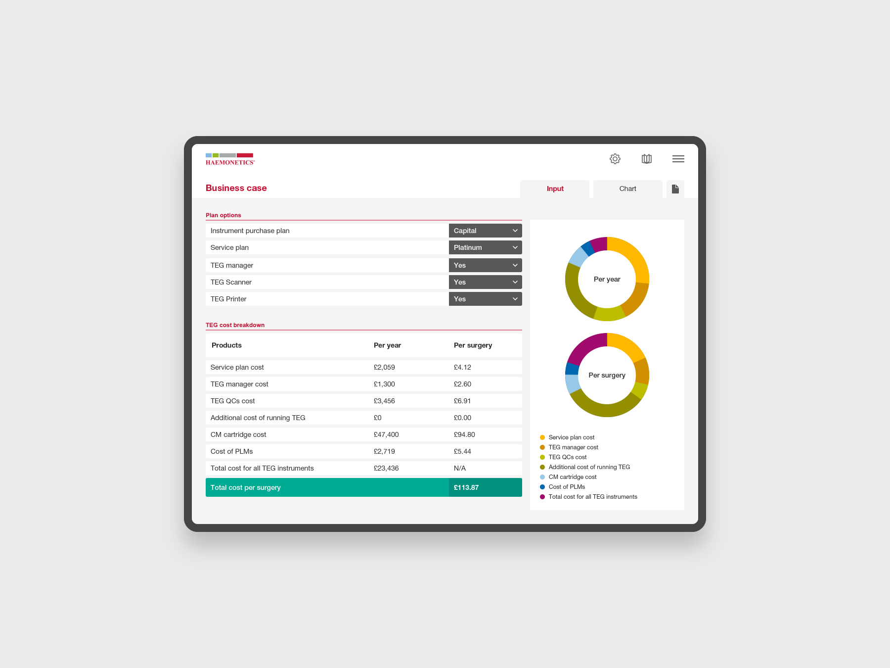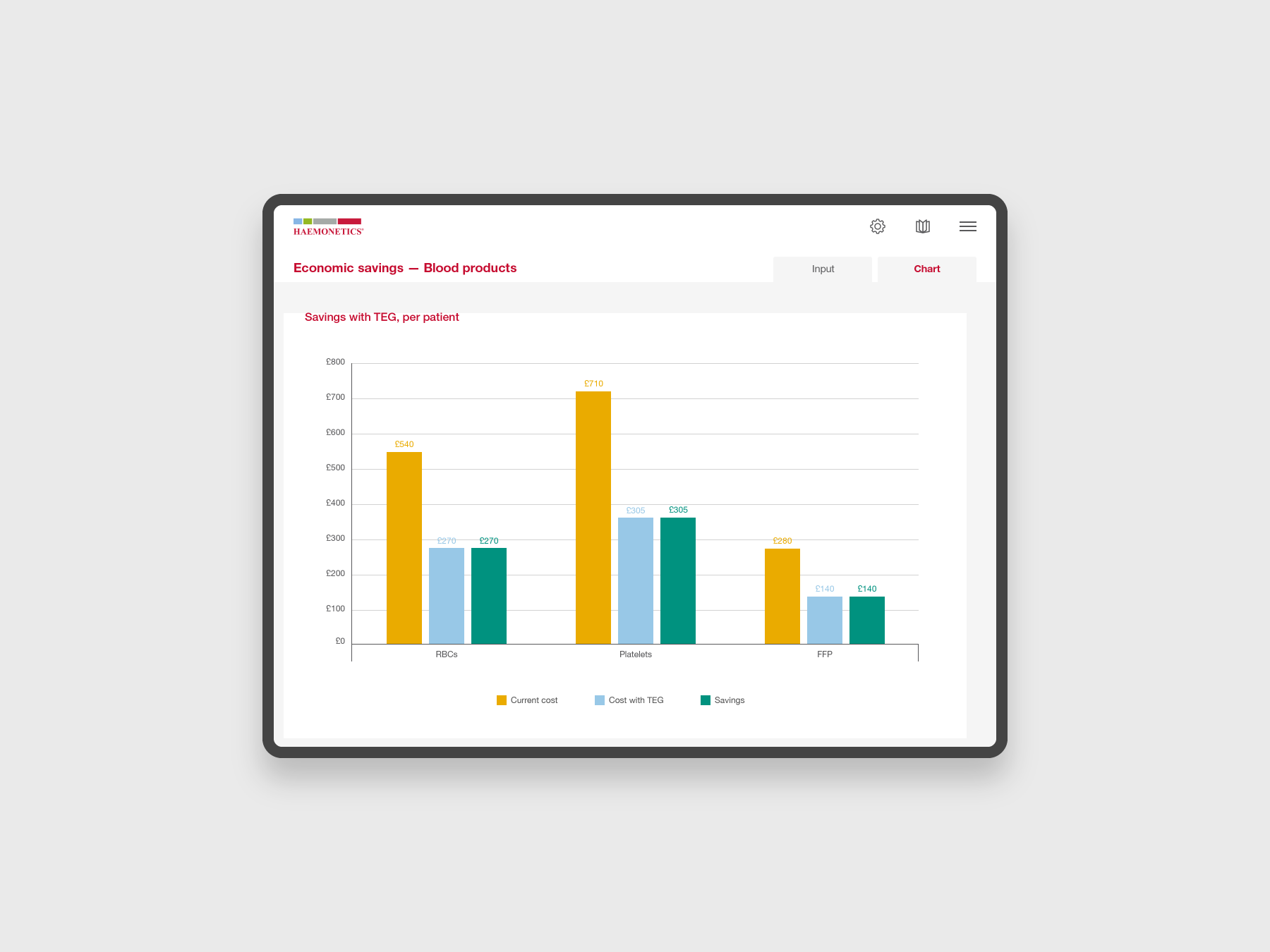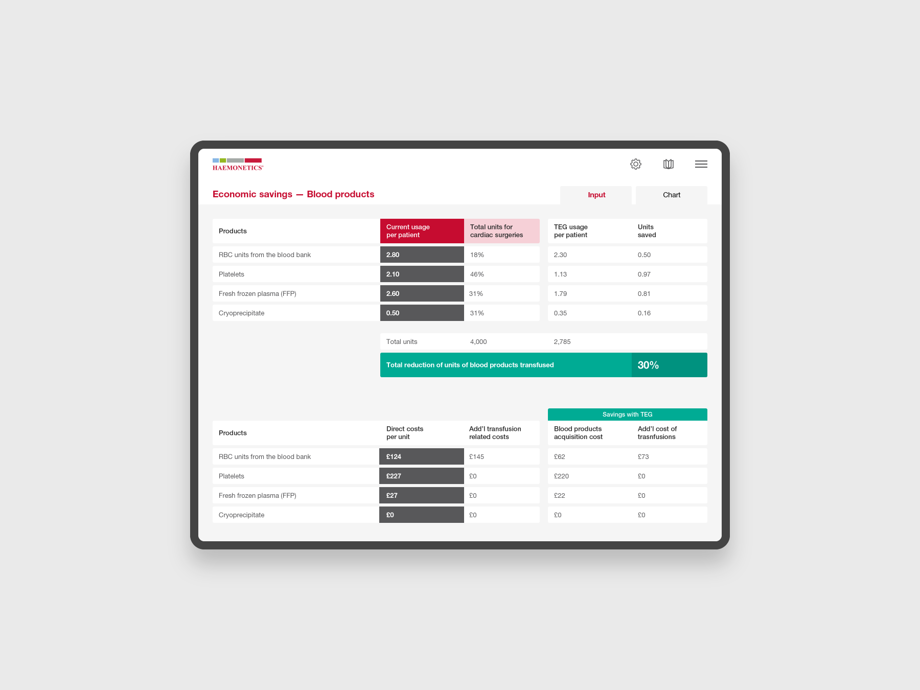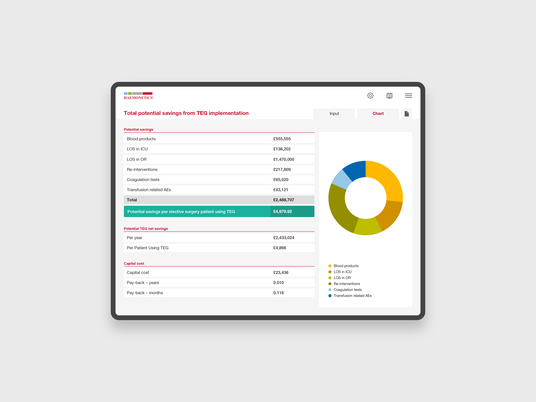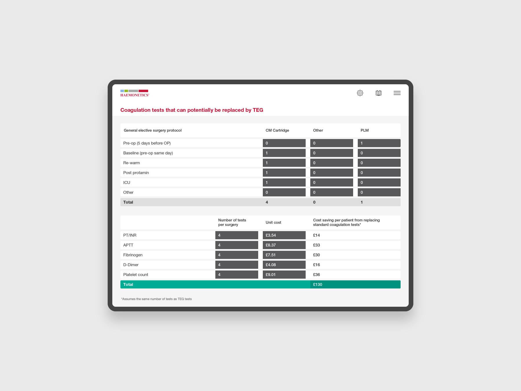An intuitive iPad application was developed to guide reps through equipment setup, real-time calculations, and cost comparisons. Enabling efficient, data-driven decision-making for TEG solutions.