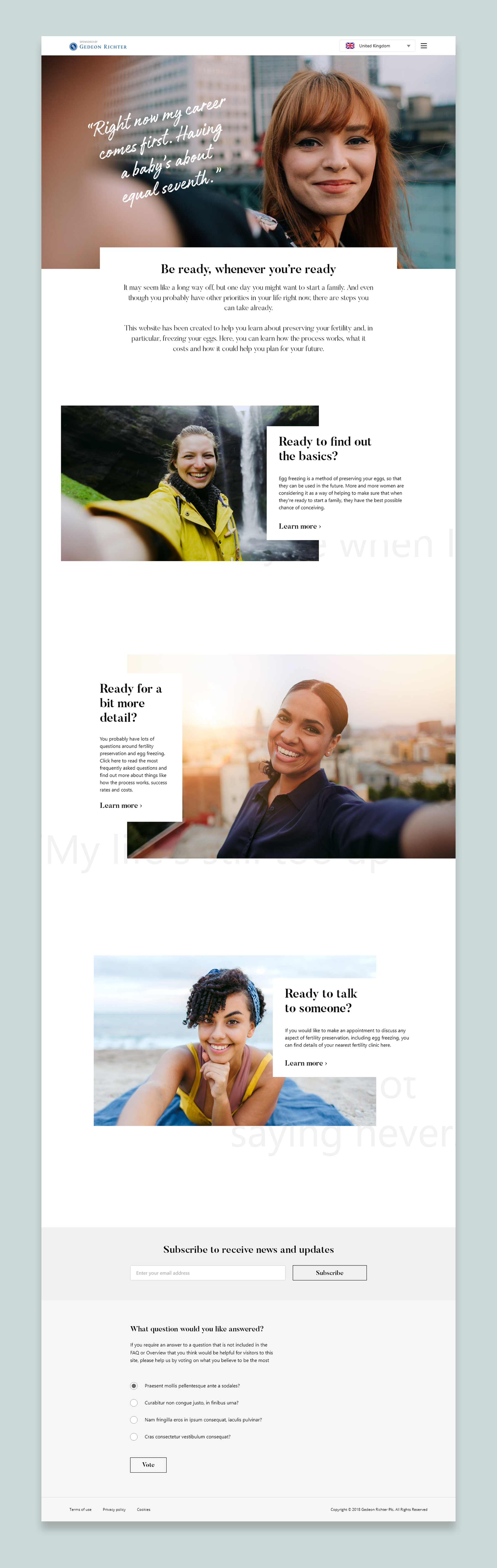 PregLem is a Swiss biopharmaceutical brand of Gedeon Richter that specializes in women’s reproductive health, focusing on innovative treatments for conditions such as uterine fibroids and endometriosis. Known for its science-led approach, PregLem addresses unmet medical needs in gynecology through targeted, research-driven therapies. As part of its commitment to empowering women with reproductive choices, the company launched the "Be ready, whenever you're ready" campaign to encourage open conversations around fertility preservation, specifically egg freezing. The campaign provides clear, factual information to help women better understand the process, its benefits, and the associated costs. The production involved three female models who would represent the typical target demographic. Each was given a name, and a back-story as to why they would like to freeze their eggs. Each then had a photoshoot, on location, to create the image assets for the website.